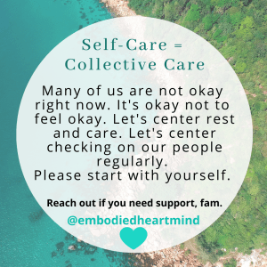 How are you? Are you okay? I’m offering this post as support for checking in with yourself and your people. I’ve heard from at least four peers who work in mental health who lost a client or loved one to suicide in the past week. These times are intense and I have concern that they may continue to intensify in upcoming months. Please check in regularly and seek any support or care you may need. Check in on each other. Check in on community.