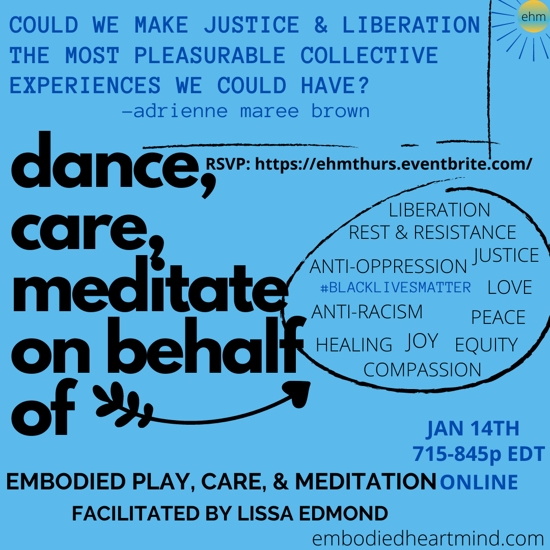 This offering will hold space space for embodied care in the form of play, movement, dialogue, mindfulness, music, and more with a centering of pleasure activism (a la adrienne maree brown), community, and the intersects of care, pleasure and justice.